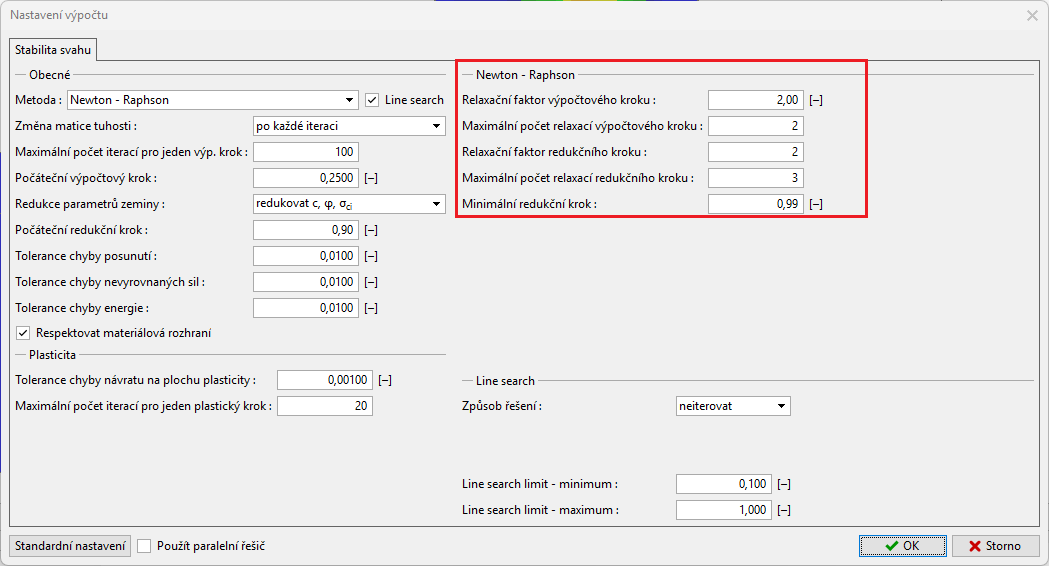 V programu lze hodnotu redukčního faktoru adaptivně upravovat. V případě, že řešení nekonverguje pro stávající hodnoty parametrů c, φ, snižuje se automaticky hodnota redukčního faktoru a výpočet se restartuje. Tento postup je řízen parametry nastavení v okně "Nastavení výpočtu" - záložka Newton-Raphson.