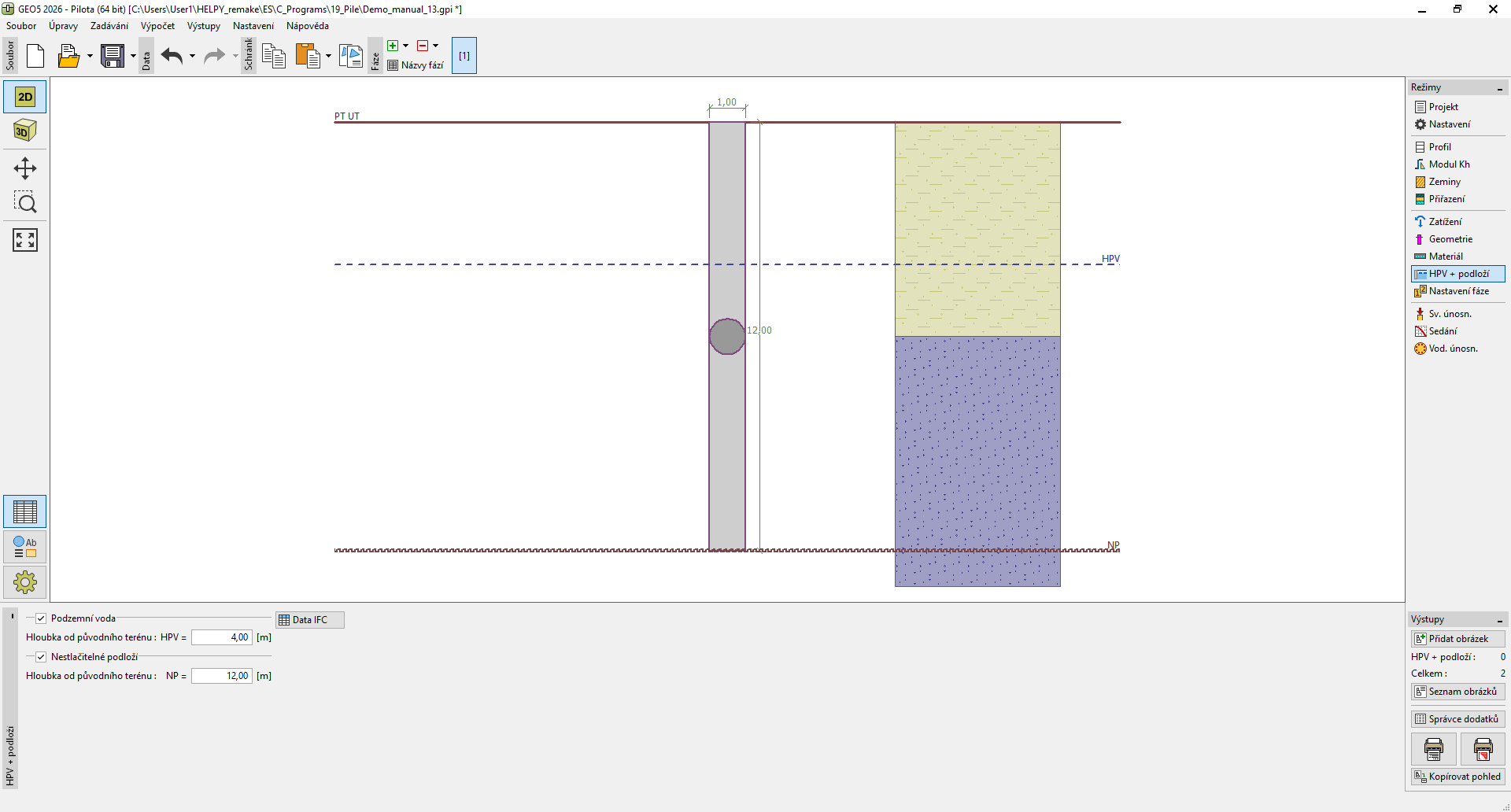 V rámu "Voda + NP" se zadává hloubka hladiny podzemní vody a hloubka úrovně nestlačitelného podloží.