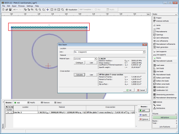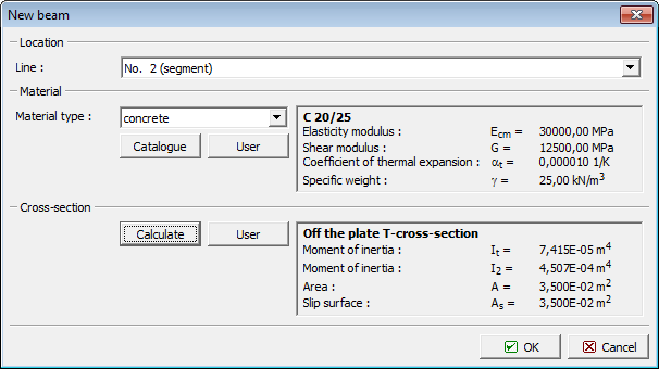 The dialog widow serves to define the line number of the beam location and material and cross section of the beam. Choosing the type of material (concrete, steel, other) then allows for assigning the material parameters either from the catalog of materials or manually using editor of materials. The cross section parameters (based on type of cross section) can be either calculated in the window "Calculation of cross sectional parameters" or manually input in the "Input of cross sectional parameters" window.