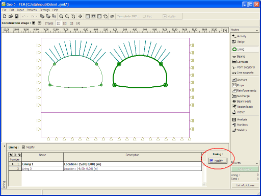 To adjust the lining the program launches the module "Lining - FEM". Its function is described in detail in the "Topology" regime in the "Lining" frame. In stages of construction the "Lining - FEM" module contains the "Beams", "Anchors" and "Beam loads" frames.