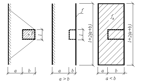 Se a largura b da sobrecarga superfícial for superior à distância a, medida a partir da parte posterior da parede (ver figura), a carga contínua alternativa f, com comprimento l+2(a+b) e largura (a+b), é dada por: