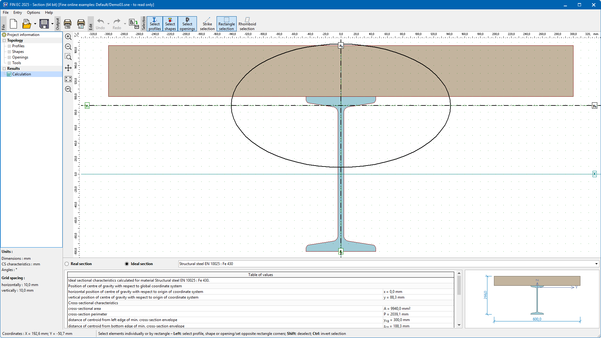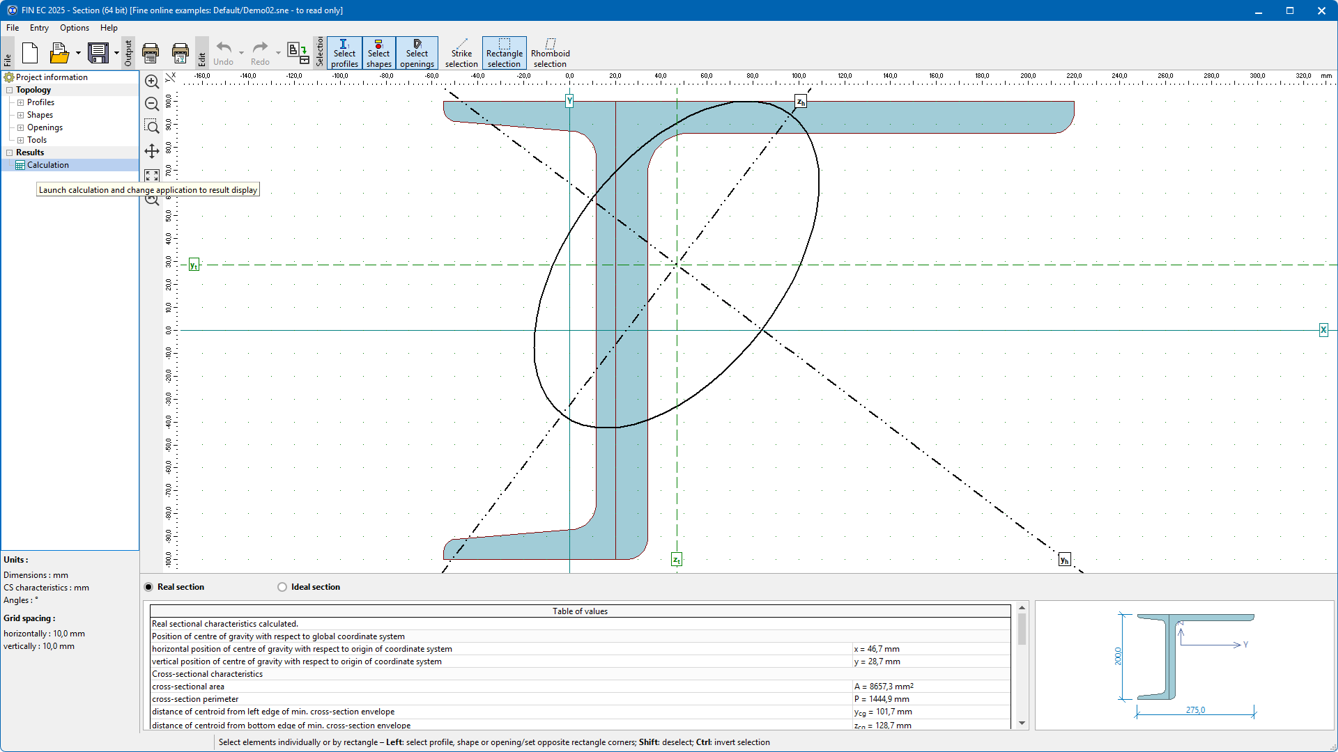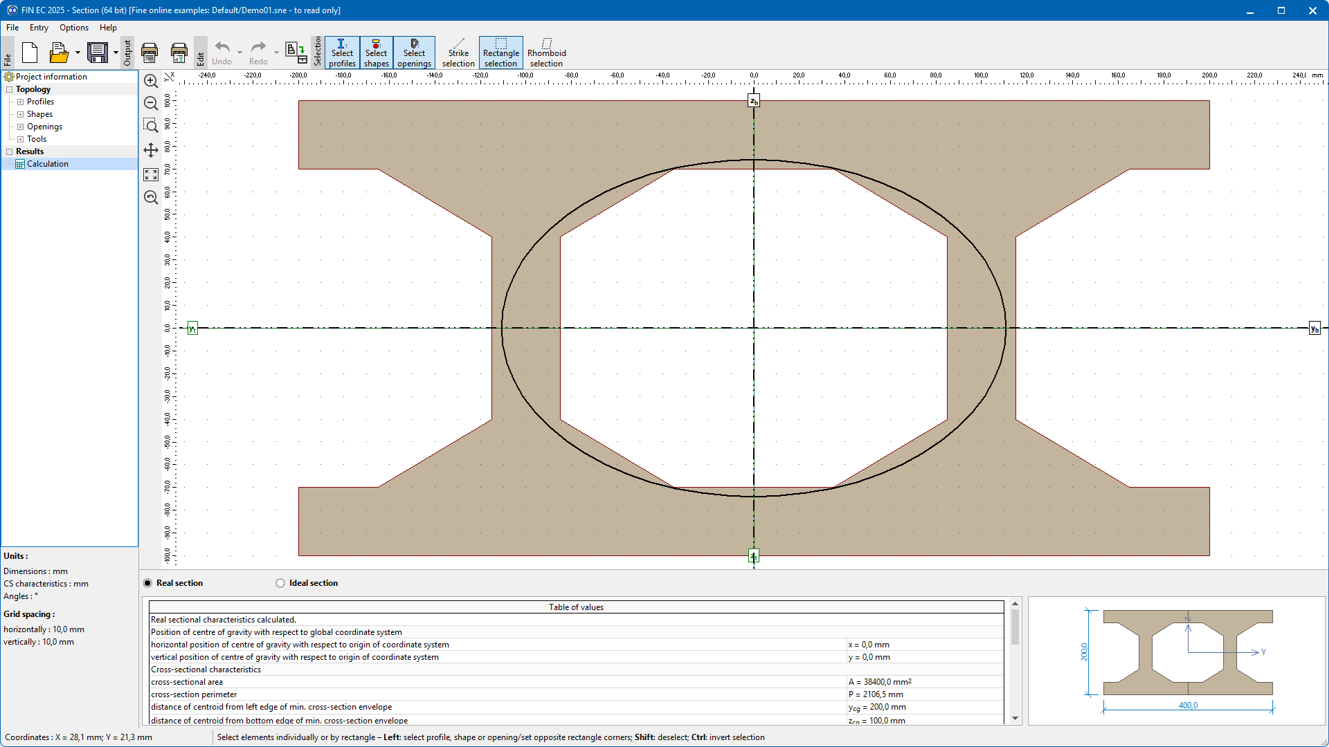 The program calculates cross-sectional characteristics of arbitrary cross-sections. Both different shapes and materials can be combined in the software.